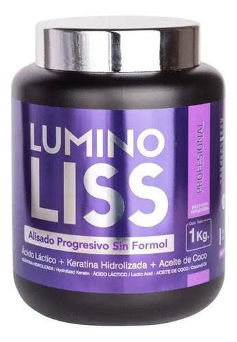 Lumino Liss es un alisado progresivo de uso profesional libre de formol, formulado con Ácido Láctico, Aceite de Coco y Keratina Hidrolizada, junto con el exclusivo Lumini System, que garantiza un brillo extraordinario y un lacio perfecto por mucho más tiempo.
