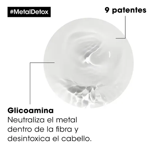 METAL DETOX, máscara protectora para el cabello, una nueva tecnología patentada sin sulfato está enriquecida con glicoamina, una molécula lo suficientemente pequeña para penetrar y neutralizar el metal DENTRO de la fibra.